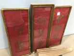 Three Hand Painted Chinese Panels, gold gilt framed, framed at Brown's, 17"h., 6 1/2"w., Needle Point Silk, and Umbrella Top Three Hand Painted Chinese Panels, gold gilt framed, framed at Brown's, 17"h., 6 1/2"w., Needle Point Silk, and Umbrella Top