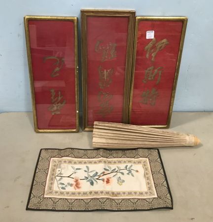 616 Three Hand Painted Chinese Panels, Needle Point Silk, and Umbrella Top