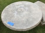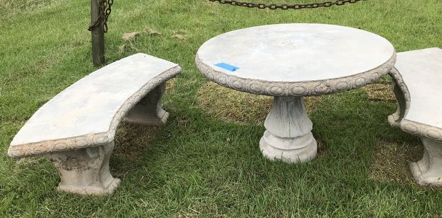 Concrete Outdoor Pedestal Table with Two Benches, heavy, sales as a set, has some outdoor wear. Concrete Outdoor Pedestal Table with Two Benches, heavy, sales as a set, has some outdoor wear.