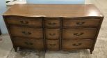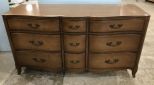 Drexel French Style Triple Dresser, 9 drawers, bow front, faded on some exterior areas, solid piece, 32"h., 60"w., 20"d Drexel French Style Triple Dresser, 9 drawers, bow front, faded on some exterior areas, solid piece, 32"h., 60"w., 20"d