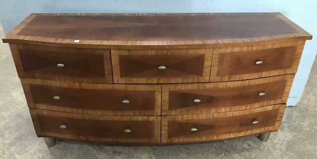 Modern Banded cherry dresser, 7 drawers, used condition, scratches on exterior, 35"h., 69"long., 20"d. Modern Banded cherry dresser, 7 drawers, used condition, scratches on exterior, 35"h., 69"long., 20"d.