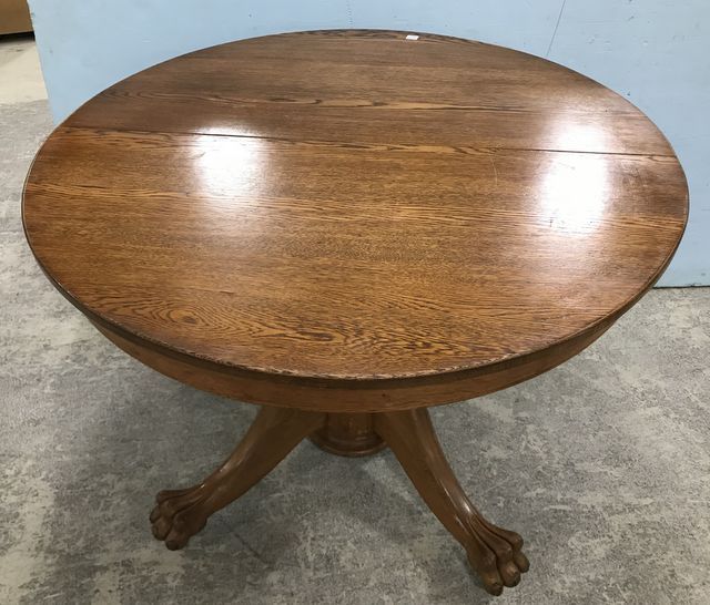 Round Oak Claw Foot Pedestal Table, Spilt pedestal with two leaves, on casters, 30"h., 42"dia. Round Oak Claw Foot Pedestal Table, Spilt pedestal with two leaves, on casters, 30"h., 42"dia.