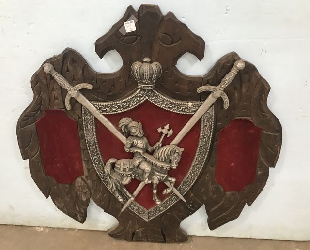 Vintage Wood Carved Shield Plaque, carved design with pot metal emblem of Knight, 31"h., 30"w. Vintage Wood Carved Shield Plaque, carved design with pot metal emblem of Knight, 31"h., 30"w.
