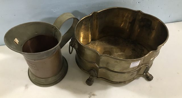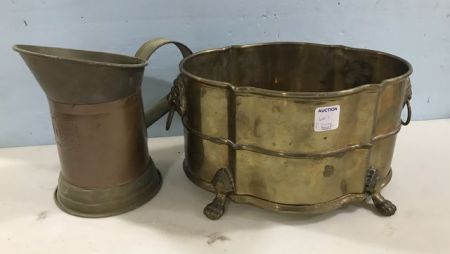 India Brass Lion Head Footed Bucket 6"h., 10"dia. and Pitcher. India Brass Lion Head Footed Bucket 6"h., 10"dia. and Pitcher.