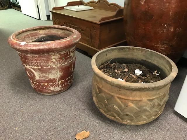 Two Terra Cotta Pottery Planters, largest is 16"h., 18"w. Two Terra Cotta Pottery Planters, largest is 16"h., 18"w.