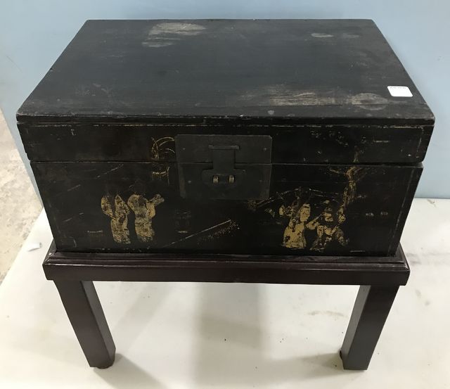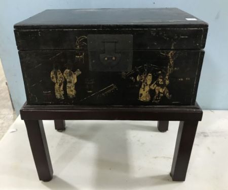 Oriental Painted Storage Trunk on Stand, black painted wood box with wood stand, lift top with handles, 20"h., 19"w., 13"d. Oriental Painted Storage Trunk on Stand, black painted wood box with wood stand, lift top with handles, 20"h., 19"w., 13"d.