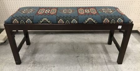 Antique Reproduction Chippendale bench, removable upholstered seat cushion, cherry frame, light scratches on leg, missing center stretcher, 18"H., 40"W. Antique Reproduction Chippendale bench, removable upholstered seat cushion, cherry frame, light scratches on leg, missing center stretcher, 18"H., 40"W.