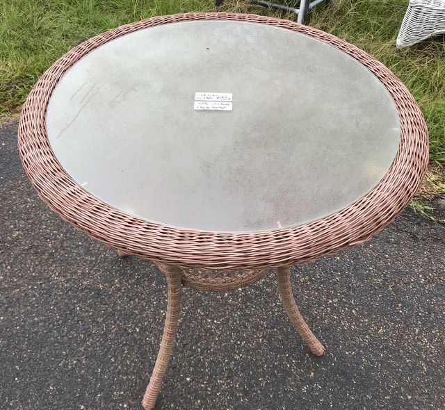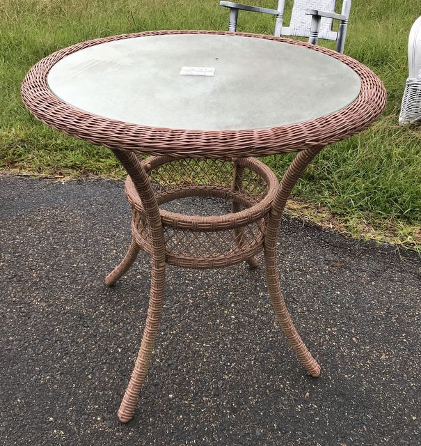 Tan Resin Wicker Round Patio Table, glass inset top, like new condition. Tan Resin Wicker Round Patio Table, glass inset top, like new condition.