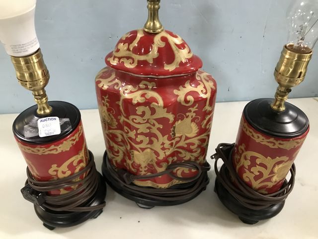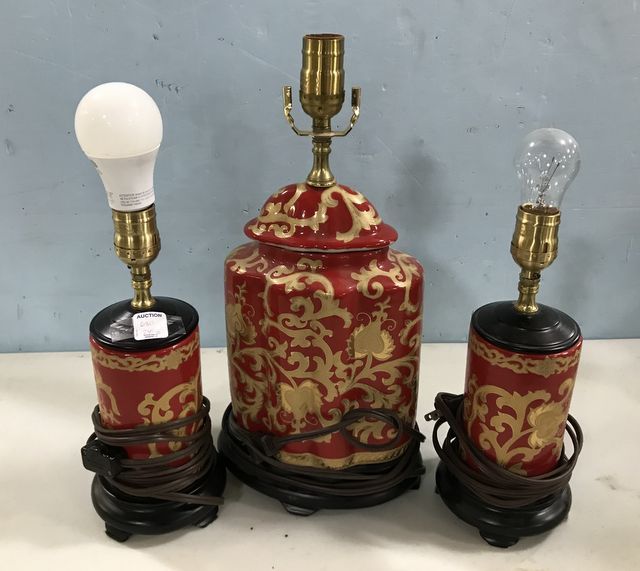 Three Red and Gold Porcelain Lamps, pair of cylinder lamps and urn lamp, made in China, 16"h. Three Red and Gold Porcelain Lamps, pair of cylinder lamps and urn lamp, made in China, 16"h.
