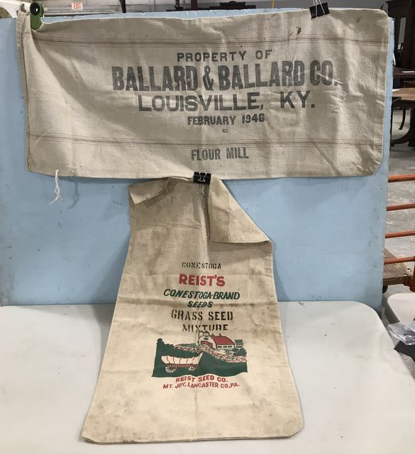 Ballard & Ballard company flour sack dated 1946 and Constoga Brand grass seed sack 34" x 18". Ballard & Ballard company flour sack dated 1946 and Constoga Brand grass seed sack 34" x 18".