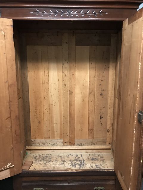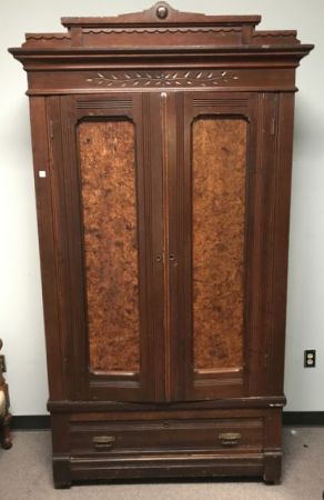 Antique Victorian Mahogany Double Door Armoire, missing center support board for doors to close, single drawer, has removable crest, needs work, has wear, 84"h., 45"h., 19"d. Antique Victorian Mahogany Double Door Armoire, missing center support board for doors to close, single drawer, has removable crest, needs work, has wear, 84"h., 45"h., 19"d.