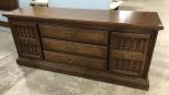 Vintage oak dresser, three center drawers, two door with inner drawers, has some wood finish wear, two wheels, missing two, 30"h., 72"long, 19"d. Vintage oak dresser, three center drawers, two door with inner drawers, has some wood finish wear, two wheels, missing two, 30"h., 72"long, 19"d.