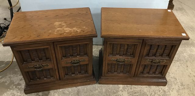 Pair of Vintage oak night stands, double doors, has worn areas on finish, 25"h., 26"w., 16"d. Pair of Vintage oak night stands, double doors, has worn areas on finish, 25"h., 26"w., 16"d.