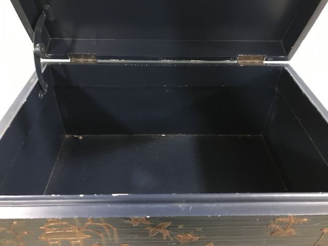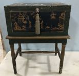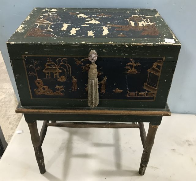 Decorative Oriental Hand Painted Box with Stand, lift top, one piece, has paint chips on finish, 25"h., 18"w., 13"d. Decorative Oriental Hand Painted Box with Stand, lift top, one piece, has paint chips on finish, 25"h., 18"w., 13"d.