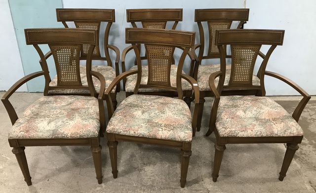 Six French Provincial Arm Dining Chairs, cane back, upholstered seats, vintage. Six French Provincial Arm Dining Chairs, cane back, upholstered seats, vintage.