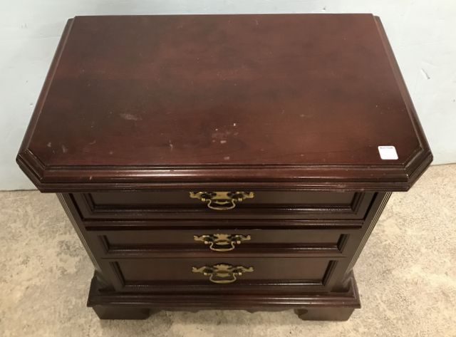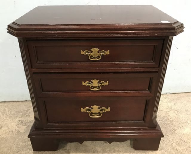 Chippendale Style Cherry Night Stand, repro, three drawers, has finish wear, scratches, 25"h., 26"w., 16"d. Chippendale Style Cherry Night Stand, repro, three drawers, has finish wear, scratches, 25"h., 26"w., 16"d.