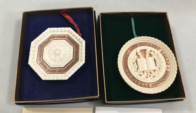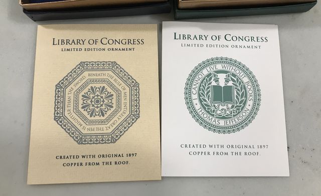 Two Library of Congress Ornament, limited edition, created with original 1897 copper from the roof. Two Library of Congress Ornament, limited edition, created with original 1897 copper from the roof.