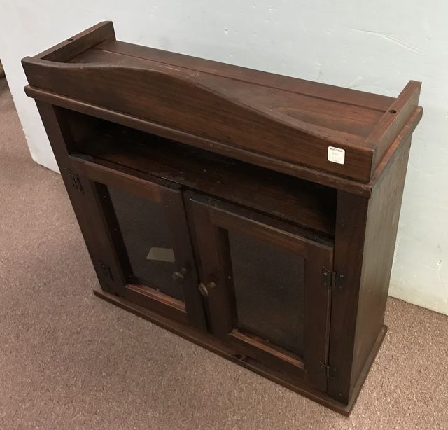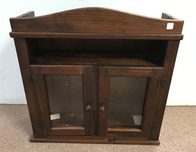 Vintage Bookcase desk top, double glass doors with inner shelf, has finish wear, 29"h., 28"w. Vintage Bookcase desk top, double glass doors with inner shelf, has finish wear, 29"h., 28"w.