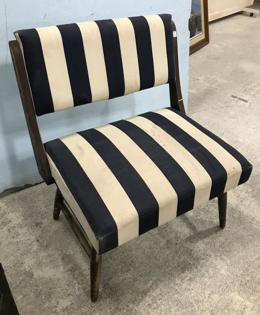 Mid Century Style Captains Chair, striped fabric, dirty, wood has wear, 32"h., 25"w. Mid Century Style Captains Chair, striped fabric, dirty, wood has wear, 32"h., 25"w.