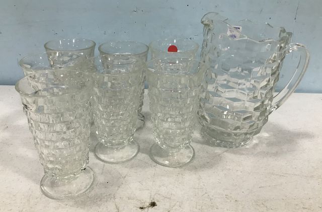 White Hall cube pattern Pitcher 8"h., 7 matching cups. White Hall cube pattern Pitcher 8"h., 7 matching cups.