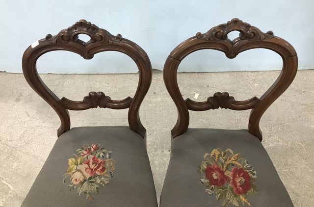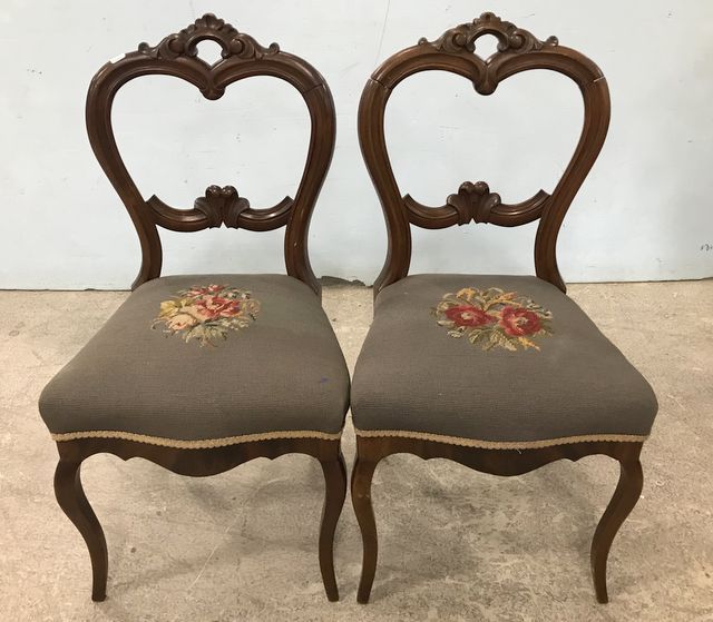 Pair of Heart Shaped French Style Side Chairs, floral needlepoint cushions, mahogany, one has repaired top, 34"h. Pair of Heart Shaped French Style Side Chairs, floral needlepoint cushions, mahogany, one has repaired top, 34"h.