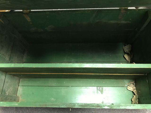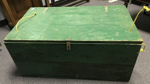 Primitive Style Hand Made Storage Trunk, painted green, lift top, divided top, 16"h., 36"w. Primitive Style Hand Made Storage Trunk, painted green, lift top, divided top, 16"h., 36"w.