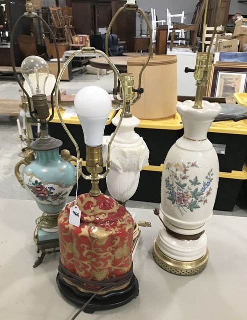 Four Decorative Lamps, Porcelain urn lamp, ceramic red and gold gilt vase, hand painted urn porcelain lamp, alabaster lamp. Four Decorative Lamps, Porcelain urn lamp, ceramic red and gold gilt vase, hand painted urn porcelain lamp, alabaster lamp.