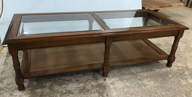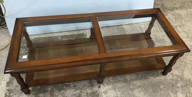 Vintage two tier coffee Table, rectangle, two beveled glass insets, one has corner small chip, cane bottom, 14"h., 50"w., 21"d. Vintage two tier coffee Table, rectangle, two beveled glass insets, one has corner small chip, cane bottom, 14"h., 50"w., 21"d.