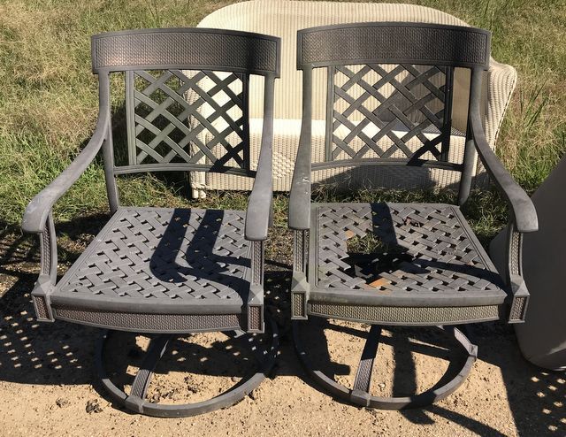 Two metal arm patio chairs, swivel base, used, average condition. Two metal arm patio chairs, swivel base, used, average condition.
