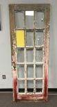 Vintage Age Distressed Wood Door, no knob hardware, 15 glass panels, one pained yellow, 79"h., 30"w. Vintage Age Distressed Wood Door, no knob hardware, 15 glass panels, one pained yellow, 79"h., 30"w.