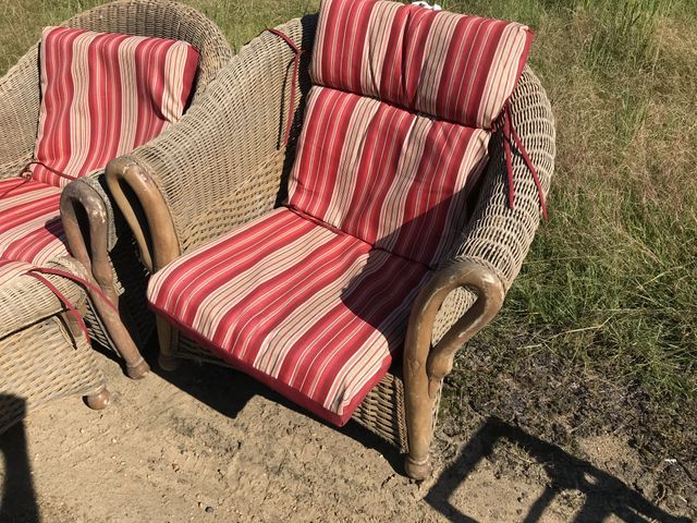 Two Tan Wicker Arm Chairs and Ottoman, swan arms, used condition. Two Tan Wicker Arm Chairs and Ottoman, swan arms, used condition.