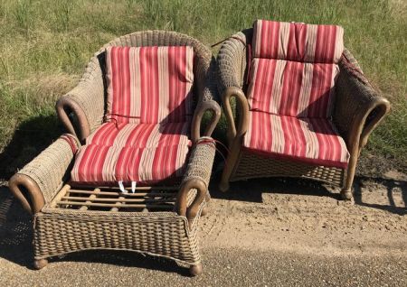 1187 Two Tan Wicker Arm Chairs and Ottoman