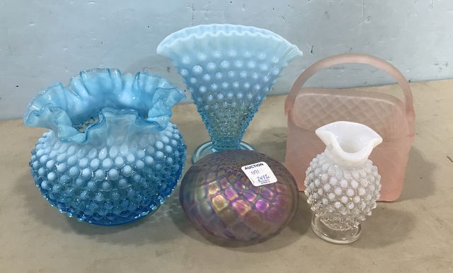 Three Hobnail style glass pieces, crimped rim vases, small vase, frosted glass basket, art glass paperweight. Three Hobnail style glass pieces, crimped rim vases, small vase, frosted glass basket, art glass paperweight.