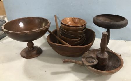 Group of wood serving pieces, compote, wood bowls, masher. Group of wood serving pieces, compote, wood bowls, masher.