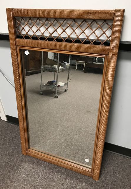 Woven wall mirror, has small piece broken on top designs, 45"h., 26"w. Woven wall mirror, has small piece broken on top designs, 45"h., 26"w.