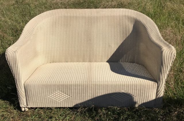 White rattan settee, used, average condition. White rattan settee, used, average condition.