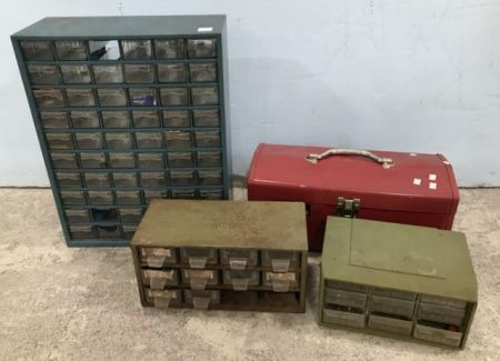 Three Tools Organizer Boxes and Tool Box, has some bolts and nuts. Three Tools Organizer Boxes and Tool Box, has some bolts and nuts.