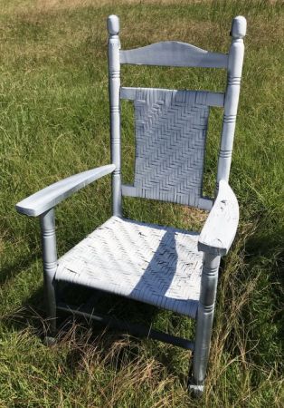 Painted White wood rocker, woven back and seat, weathered condition. Painted White wood rocker, woven back and seat, weathered condition.