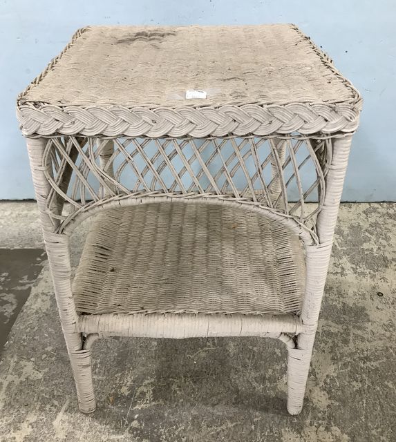Used White Wicker Two Tier Side Table, weathered, 25"h., 17"w. Used White Wicker Two Tier Side Table, weathered, 25"h., 17"w.