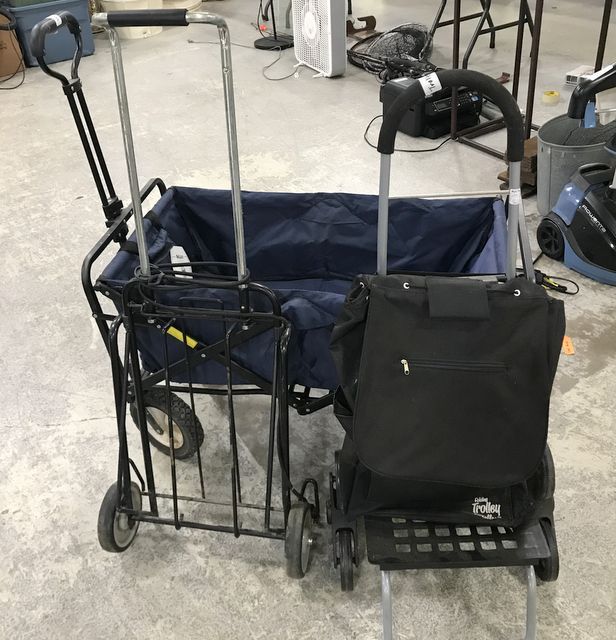 Two dollies and pull wagon, used, working condition. Two dollies and pull wagon, used, working condition.