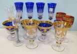 Eight cobalt blue wine glasses, two gold trim glasses, two light blue stem glasses, Two red wine glasses. Eight cobalt blue wine glasses, two gold trim glasses, two light blue stem glasses, Two red wine glasses.