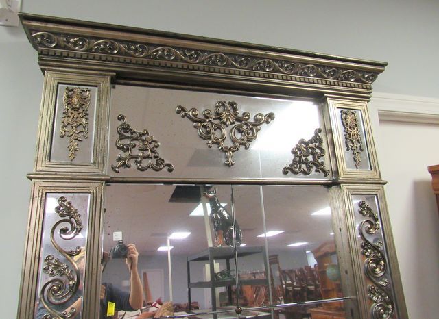 Wood panel, sectioned glass mirror, machine made ornament design, 7'6 x 4'1. Wood panel, sectioned glass mirror, machine made ornament design, 7'6 x 4'1.
