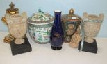 Gold painted ornament 11"h., Toyotoki vase, Oriental Accent covered urn, pair of resin urn decor stands 9"h., Maitland Smith Chinese hand painted covered bowl 9"h. Gold painted ornament 11"h., Toyotoki vase, Oriental Accent covered urn, pair of resin urn decor stands 9"h., Maitland Smith Chinese hand painted covered bowl 9"h.