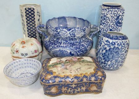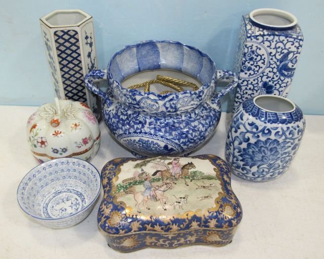 H.F.P. Macau hand painted European scene trinket box, Andrea vase, Japanese flower vase 9"h., Andrea covered dish, Takahashi Vase, Bombay Company blue and white urn. H.F.P. Macau hand painted European scene trinket box, Andrea vase, Japanese flower vase 9"h., Andrea covered dish, Takahashi Vase, Bombay Company blue and white urn.