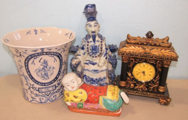 Stein Mart Blue pratt Bowl, Hand painted Hong Kong Tang TZU Chen covered dish, Blue and White ceramic King 12"h., resin battery powered mantel clock. Stein Mart Blue pratt Bowl, Hand painted Hong Kong Tang TZU Chen covered dish, Blue and White ceramic King 12"h., resin battery powered mantel clock.