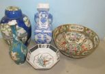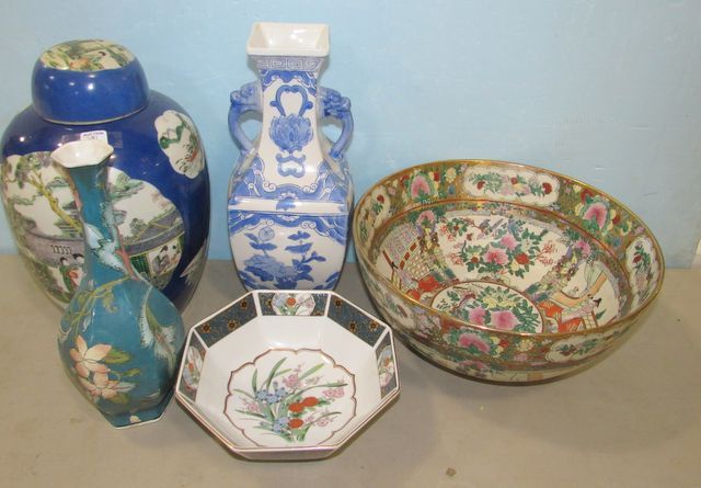 Japanese hand painted bowl 3"h., 9"dia., Macau flower vase, hand painted ginger jar, Bombay company blue and white vase, SPI accent collection bowl 6"h., 14"dia. Japanese hand painted bowl 3"h., 9"dia., Macau flower vase, hand painted ginger jar, Bombay company blue and white vase, SPI accent collection bowl 6"h., 14"dia.