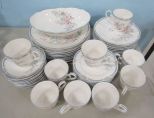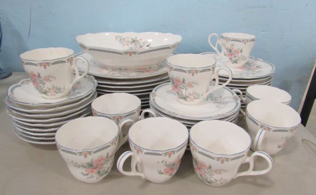 Nine dinner plates, Nine salad plates, Nine dessert plates, Nine saucers, Nine cups, Serving Bowl. Nine dinner plates, Nine salad plates, Nine dessert plates, Nine saucers, Nine cups, Serving Bowl.
