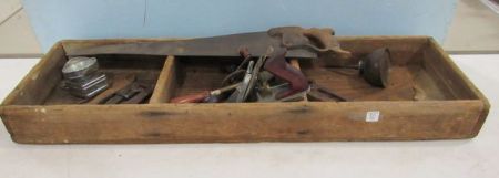 Planer, oil can, hand drill, saw, vise, crescent wrench. box is 41"w. Planer, oil can, hand drill, saw, vise, crescent wrench. box is 41"w.