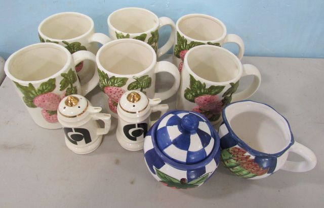 1087 Ceramic Fruit Mugs, Ceramic Sugar and Creamer, Salt and Pepper.