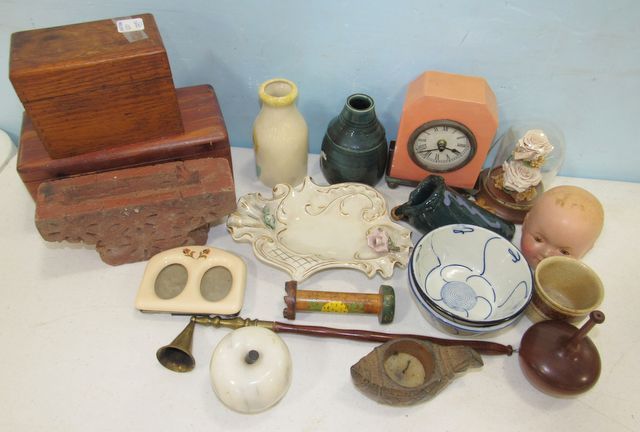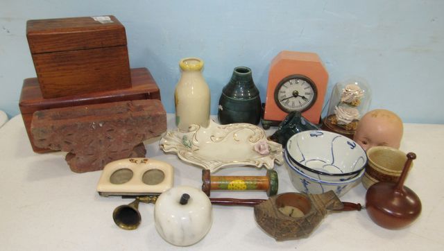 Two storage boxes, ceramic jars, ceramic clocks, handpainted dish, snuffer, blue and white bowls, picture frames. Two storage boxes, ceramic jars, ceramic clocks, handpainted dish, snuffer, blue and white bowls, picture frames.